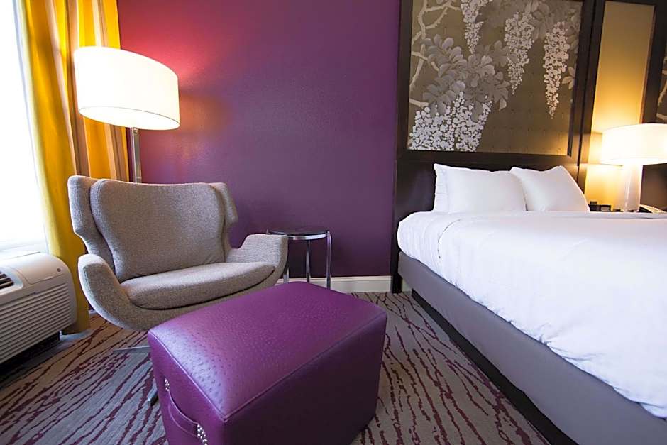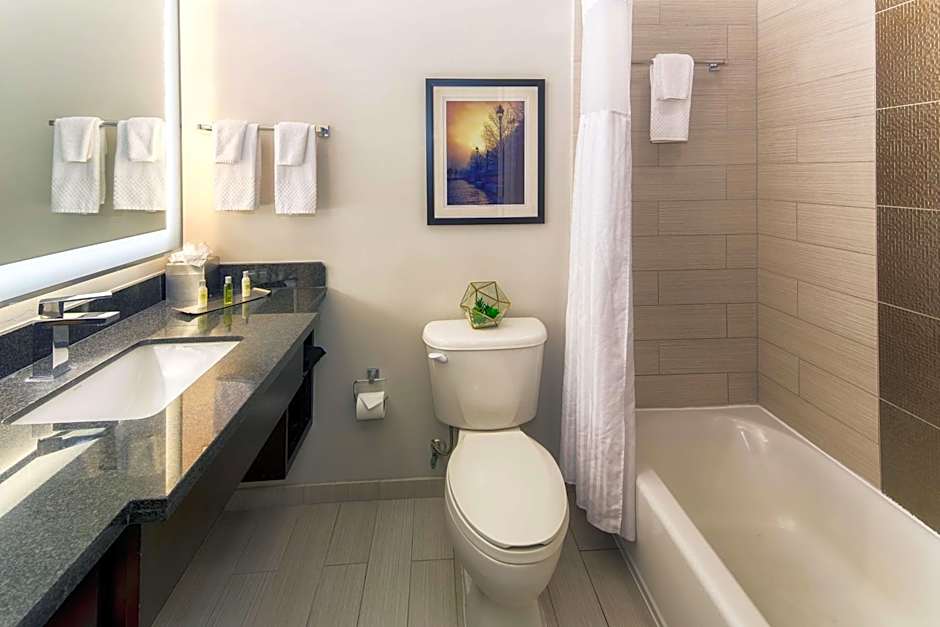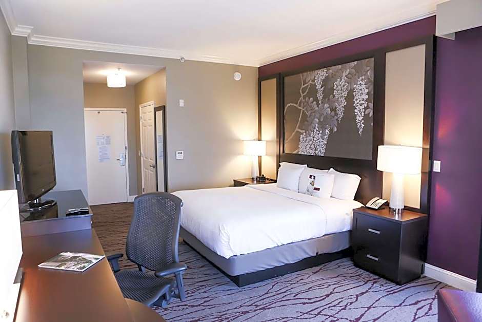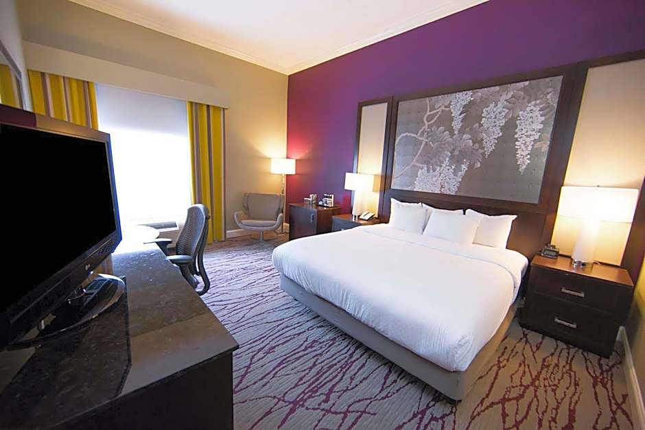 This King Room features a 37-inch flat-screen TV, a large chair, and a desk. The guestroom is mobility and hearing accessible and includes an accessible tub, visual alarm, and notification devices.