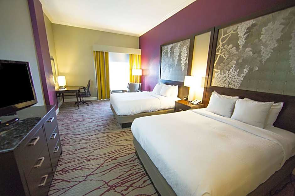 This Queen Room features a 37-inch flat-screen TV, a large chair, and a desk. The guestroom is hearing accessible and includes a visual alarm and notification devices.