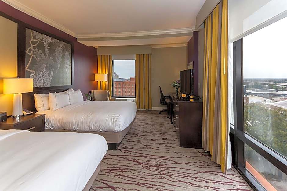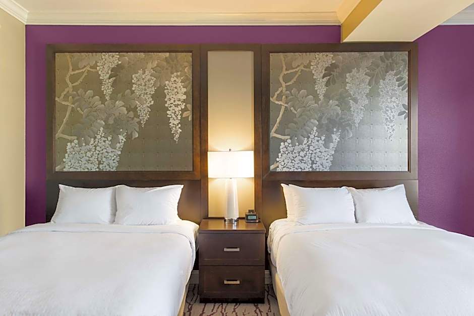 This Queen Room features a 37-inch flat-screen TV, a large chair, and a desk. The guestroom is mobility and hearing accessible and includes an accessible tub, visual alarm, and notification devices.