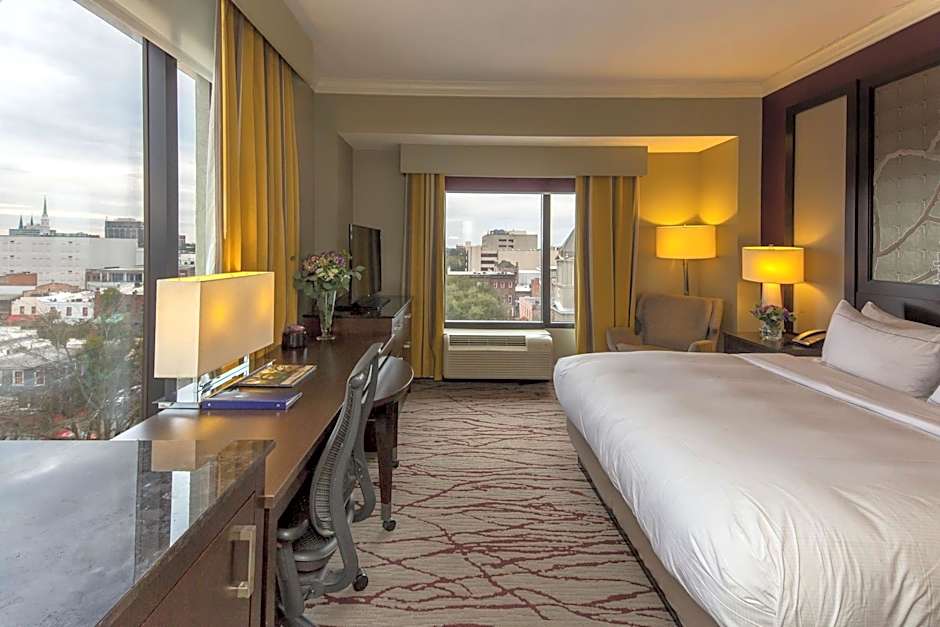 This King Room includes a separate seating area with a 37-inch flat-screen TV. A desk, large chair, and a private bathroom complete with a spa bath and granite countertops.