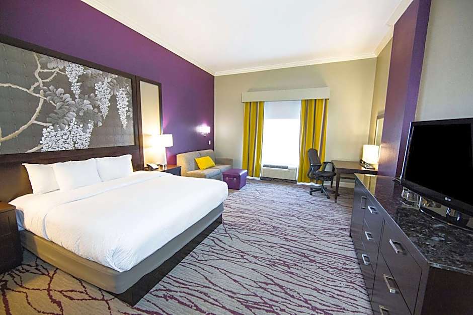 This King Room includes a 37-inch flat-screen TV, a large chair, and a desk. The private bathroom includes granite countertops. A sofa bed is provided.